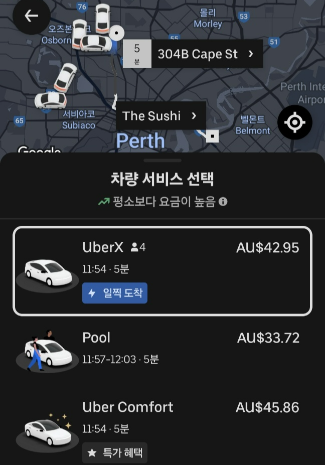 오전에 퍼스 마라톤과 시위가 겹쳐서 시티에 대중교통이 멈출거라고 했다. 그래서 맘편하게 디디타고 가야지 생각하고 가격 봤는데 17불 정도 나오길래 괜찮네~ 하고 준비했다. 근데 진짜로 디디 잡으려고 켠 순간 이용자가 많다며 37불까지 오르길래 뭐지;; 하고 우버로 봤는데 42불 뜨길래 아 오늘 쉴까,, 한 순간 디디 가격이 21불로 내려가서 냅다 잡고 출근했다. 15분 타는데 3n불은 에바지,, 디디랑 우버랑 무슨 싯가도 아니고 사람 몰리면 가격 순식간에 올라가는거 아직 적응 안 된다 ㅜ 근데 그래도 할증 개념은 없는지 낮에 잡는 것보다 새벽에 잡는게 더 저렴할 때도 있음.
