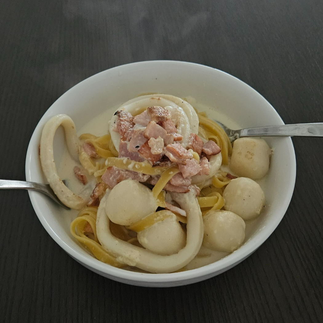집에와서 뭐 먹지 하다가 우유 유통기한이 지났길래.. 크림파스타 해 먹었다. 남들은 유통기한 지나면 버리지만,, 난 걍 먹음ㅎ 먹어도 탈 안 나더라~ 집에 베이컨이랑 깔라마리랑 피쉬볼 남은 게 있길래 그것도 넣어서 먹었다. 먹다가 싱거워서 치즈 더 넣고 전자렌지에 돌렸더니 꾸덕꾸덕 아주 맛있었음.