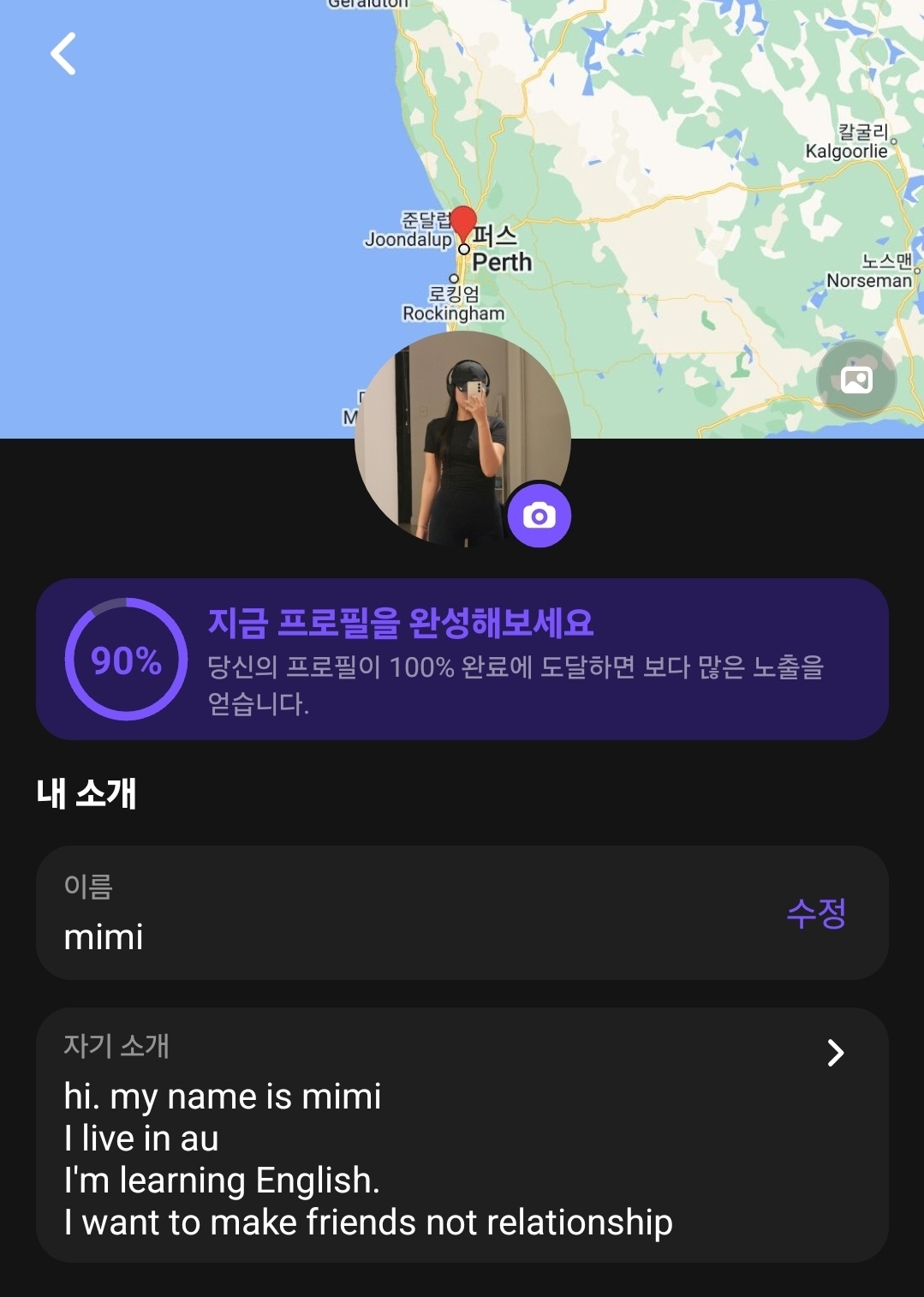 그리고 드디어 헬로우톡을 시작했다. 다들 틴더나 범블같은 매칭앱 추천했는데 너무 귀찮아질 것 같아서 나름 언어교환 앱인(?) 헬로톡으로 시작! 다운은 진작에 받아놨는데 귀찮아서 안 열다가 외국인 친구 사귀기 정말 쉽지 않고 그러다 보니 영어 말할 일도 너무 없어서 시작함! 최대한 만날 수 있는 친구를 만들고 싶다. 나 영어 스피킹 늘리고 싶다고!! 온라인 친구는 필요 없음,, 전화도 안 좋아하긴 하는데 호주 집 방음이 안 되는 편이라 전화는 더더더 꺼려진다. 처음에 아무 정보도 안 올렸더니 자꾸 어디 사람이냐 어디 사냐 물어보길래 간단히 소개란에 적어놓음 ㅋㅋㅋ 누가 봐도 귀찮은 거 티 나는 나의 써머리..