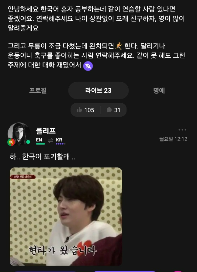 그래도 내가 영어 틀리게 쓰면 고쳐주는 사람들도 있고 보이스로 보내면서 리스닝하라는 사람들도 있다. 아주 좋았음. 보이스룸 들어가면 온갖 나라에서 다양한 발음으로 말하는 영어를 들을 수 있어서 좋은 것 같다. 조금 더 지켜봐야겠지만 지금까진 나름 나쁘지 않은 앱인듯?!
