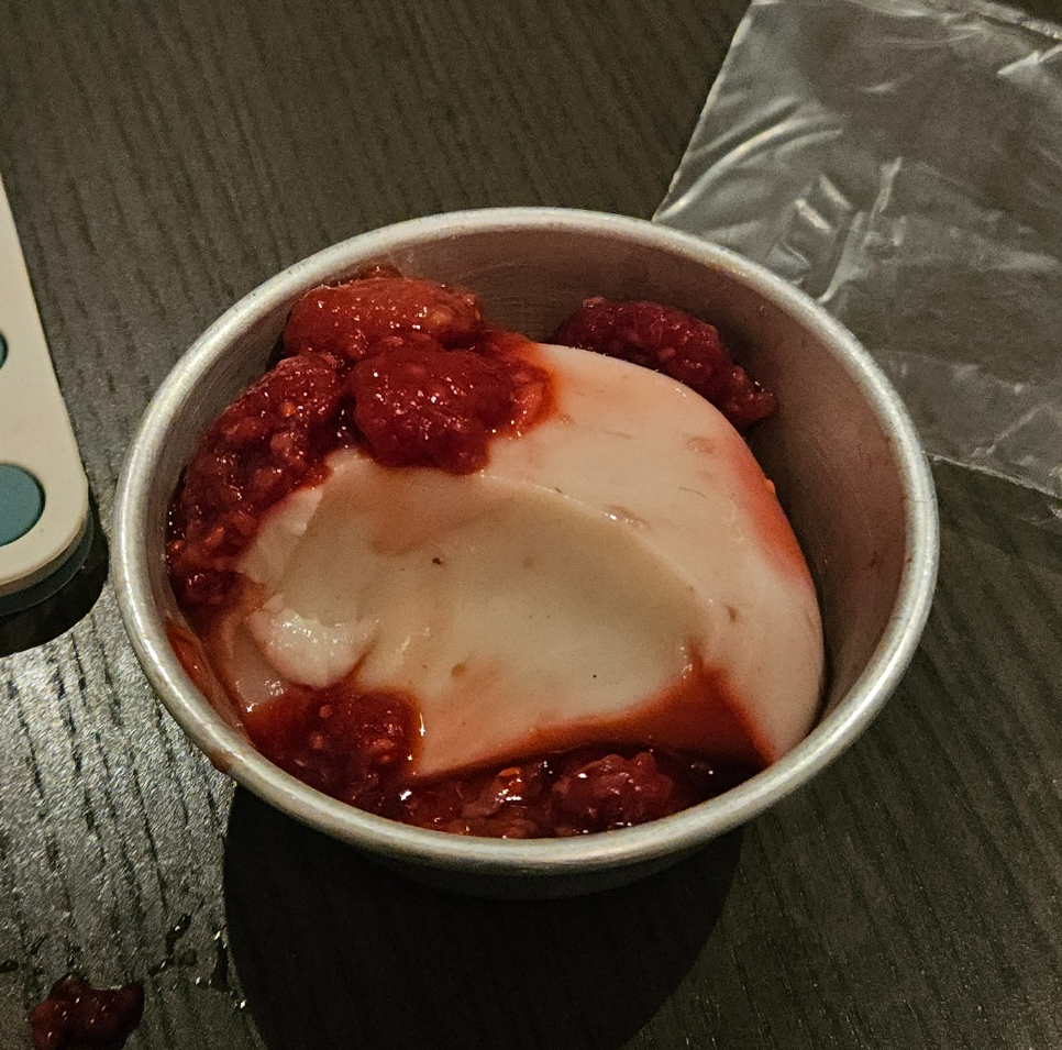 밥 먹고 있는데 지민님 들어와서 또 디저트 나눠줌 ㅜㅜ 푸딩 비슷한 뭐라고 했는데 기억이 안 난다. 맛있었음. 나 분명 디저트 안 좋아하는 사람인데 주는 족족 맛있게 먹고 있다ㅋㅋㅋㅋㅋ 일본 푸딩도 너무 달고 식감이 이상해서 한 입 먹고 안 먹었는데 이건 다 먹음. 나 어쩌면,, 디저트 좋아하는 사람일지도..?