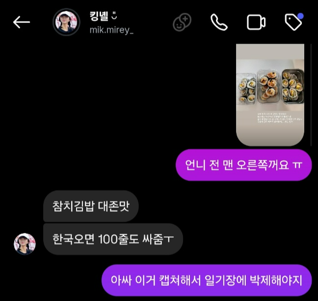 예리밍 언니가 대충 싼 김밥 올렸길래,, 맛있어 보여서 구걸함 흐흐 한국 가면 참치 김밥으로 돈 쓸 일 없겠다 낄낄 ❤️